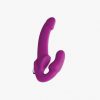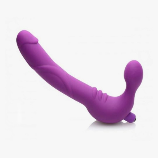 Strap U Royal Revolver Vibrating Strapless Strap On Dildo from XR Brands. This silicone strapless strap on brings pleasure to both you and your partner! Whether you are using it for pegging or sex between two females, this carefully designed dildo will enhance the experience with the exciting shape and powerful vibration. The bulb allows you to experience vaginal penetration while your clitoral rubs sensually against the three ridges of the clitoral pad. The long shaft has comfortable girth with a raised design to massage your partners orifice. The prominent head and slight curve are ideal for G-spot or P-spot stimulation. An extra long vibrating bullet will send buzzing bliss into both partners for greater satisfaction. This bullet vibrator can also be removed to tantalize on its own. Made of premium silicone, this double dildo is non-porous and phthalate free. Avoid use with silicone lubricant and clean with mild soap and warm water.